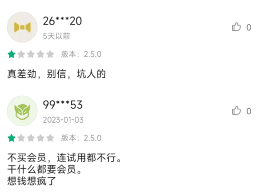 点进去查看用户评论,全是关于广告多还有会员收费不合理的差评。