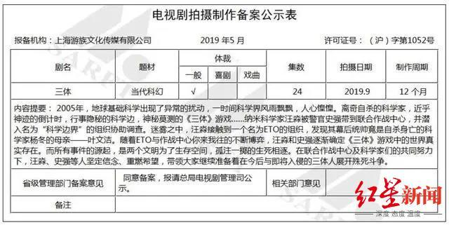 早在2016年,《三体》曾出现在广电总局当年6月的备案信息中,集数为32集,预计拍摄时间为同年的12月。