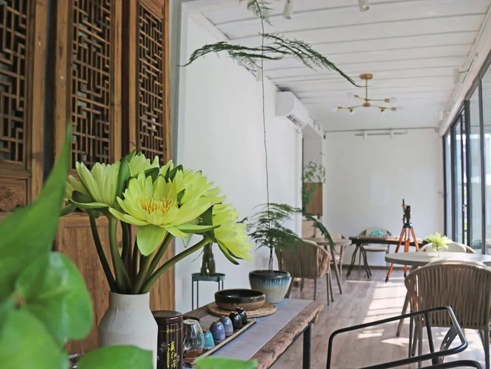 旧式的院落保留着曾经的时光,庭院两旁青竹绿草,围坐在茶几边,享受清茶感受往昔的迷人风情,畅然自得。