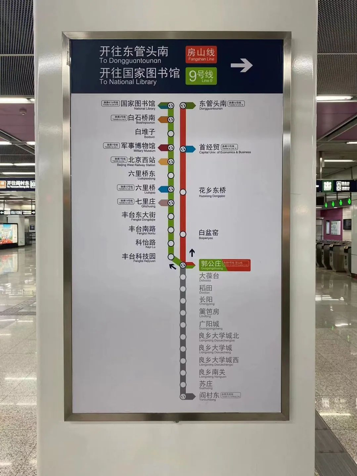 车站还更新了站台门上方的线路图,将房山线和9号线两条线路的站点画在了一张图中。
