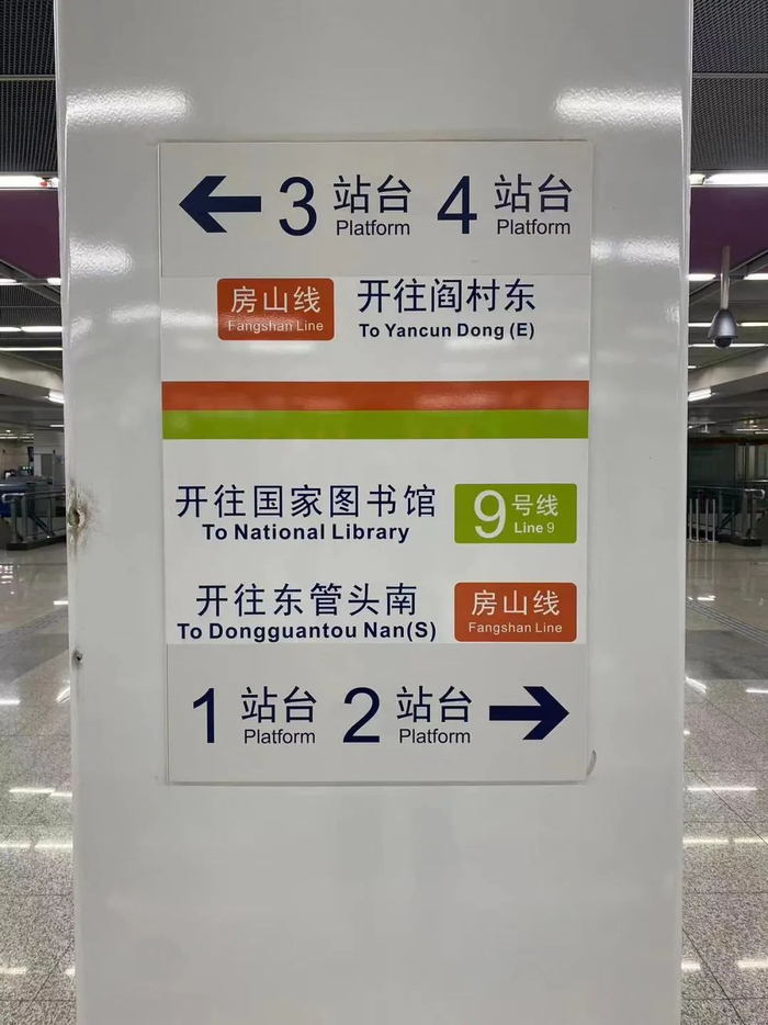 1站台停靠房山线(开往东管头南)和房山线-9号线跨线车(开往国家图书馆)