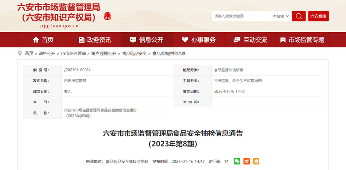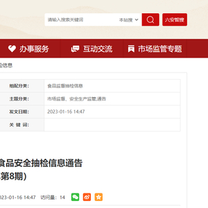 中国质量新闻网讯 2023年1月16日,安徽省六安市市场监督管理局发布食品安全抽检信息通告(2023年第8期)。