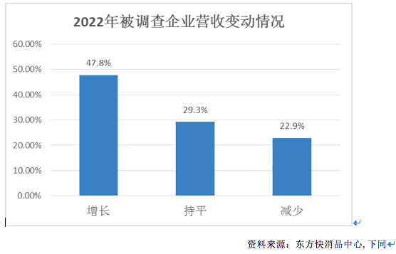 东方快消品中心发布的《2022中国快消品产业年度报告》显示: 2022年营收增长的快消品企业占比为47.8%,相比2021年的70.5%下降了22.7个百分点,有29.3%的被调查企业表示2022年营收与上年持平,有22.9%的快消品企业表示2022年营收减少。此前贝恩公司的一份调查显示,2022年中国快消品的销售较上年同期增长5.9%,展现出较强韧性。