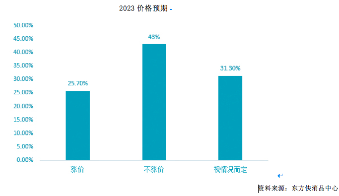 第五,通胀下不涨价,自我消化占多数。众多快消品品牌对2023年产品是否涨价做出了谨慎的判断。在本次百位高管年度访谈调研中,25.70%的高管2023年计划对产品进行涨价,因为受到俄乌战争等国际因素的持续影响,大宗商品、原材料、运输、人力成本等大都涨价;43%的高管认为2023年不会对产品进行涨价,通过自我消化,提升市场占有率;而31.30%的高管表示不确定,要依据市场的走向和发展态势以及竞争对手的策略来决定。