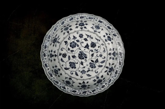 ▲永乐青花缠枝牡丹菱口瓷盆 明
