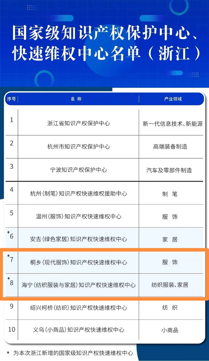 近日,国家知识产权局同意安吉(绿色家居)、桐乡(现代服饰)和海宁(纺织服装与家居)知识产权快速维权中心通过验收,正式投入运行,这也是嘉兴建设的首批快维中心,数量居全省前列。至此,浙江省共有国家级知识产权保护中心、快速维权中心10家。