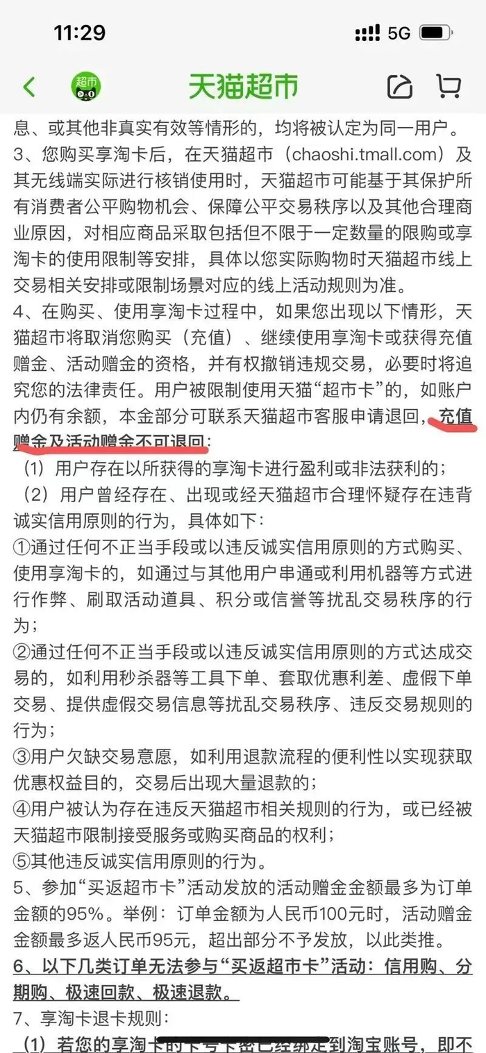《天猫超市卡使用规则》对此有说明:一方面,天猫超市可能基于其保护所有消费者公平购物机会、保障公平交易秩序以及其他合理商业原因,对相应商品采取包括但不限于一定数量的限购或享淘卡的使用限制等安排;另一方面,如果用户曾经存在、出现或经天猫超市合理怀疑存在违背诚实信用原则的行为,也将被取消购买(充值)、继续使用享淘卡或获得充值赠金、活动赠金的资格。