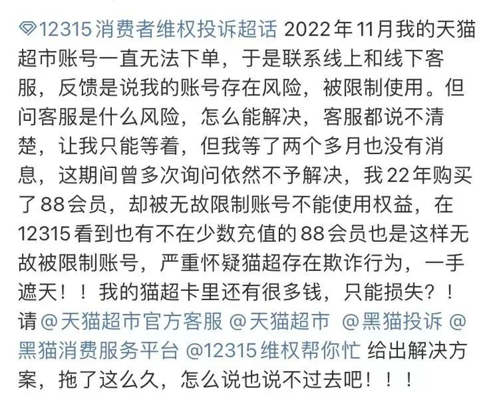 “被天猫超市限制购物,已经好几个月没法下单了,但卡内还有数千元余额,马上就过期了,怎么办?”