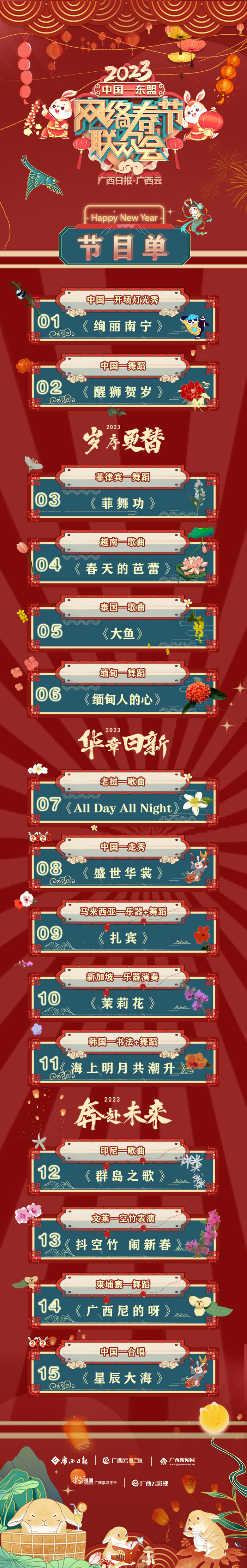 卯门生紫气,兔岁报新春。由广西日报社主办,广西云数字媒体集团、广西云·东盟国际传播联络站、广西广文院线投资集团共同承办的“春暖花开 拥抱世界”2023中国—东盟网络春节联欢会将于1月18日在南宁举行上线仪式。节目上线后,将在“学习强国”广西学习平台、广西云客户端、广西新闻网、广西云影视等平台首播,在广影国际影城连续展播3天,同时也将在柬中时报、泰国网、北欧时报、欧洲侨报等海外平台隆重推出。