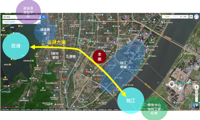 新世界·城市艺术中心位于主城上城区的中心板块——望江新城,是罕见的市中心多轨TOD。杭州城市发展已从“西湖时代”迈向“钱塘江时代”,西湖代表了杭州千年古城的历史文化底蕴,钱江新城代表了杭州成为国际化大都市的发展动力。而望江新城距离西湖直线距离约2.5公里,距离钱塘江约1.6公里,正是处于杭州历史与未来发展的交汇处。同时在城市规划上,望江新城是钱塘江金融港湾的核心产业板块,也是杭州拥江发展的城市门户区,杭港(望江)高端服务业示范区,钱塘江金融港湾连接世界的城市客厅。