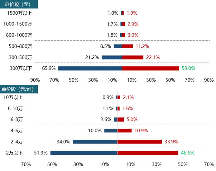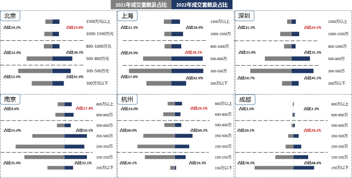 图:北京、上海、深圳、南京、杭州、成都商品住宅成交总价段结构变化