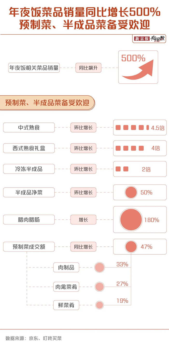 网购平台数据显示,去年12月9日以来,中式熟食的销量环比增4.5倍,西式熟食礼盒环比增长4倍,冷冻半成品环比增长2倍,半成品净菜环比增长50%。预制菜成交额同比增长47%,其中,肉制品成交额占比33%,肉禽菜肴和鲜菜肴成交额分别占比27%、19%。