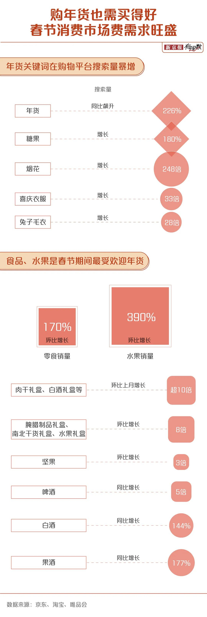 网购平台数据显示,年货节期间,肉干礼盒、白酒礼盒等环比上月销售增长均超10倍,腌腊制品礼盒、南北干货礼盒、水果礼盒环比增长8倍。坚果销售环比增长3倍,零食销量环比增长170%,水果销量环比增长390%。