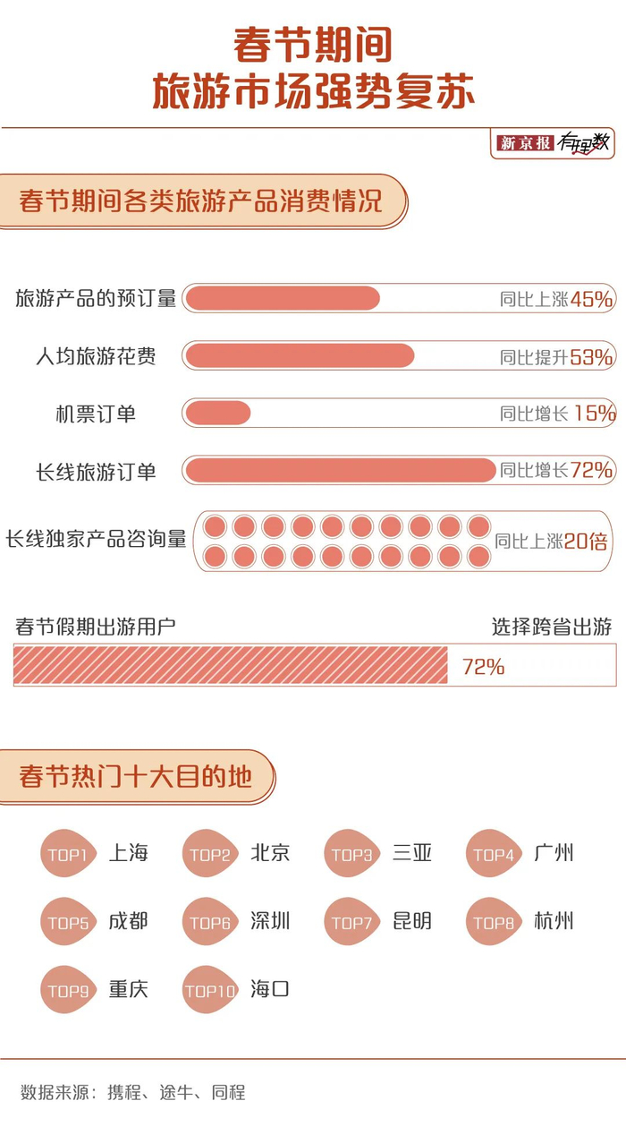 政策放开也利好旅游市场,春节和家人一起外出旅游跨年成为不少家庭的首选,据头部OTA平台数据显示,今年春节长线旅游产品备受欢迎,截至1月5日,春节假期长线旅游的订单占比达到了七成,长线游订单同比去年增长72%。