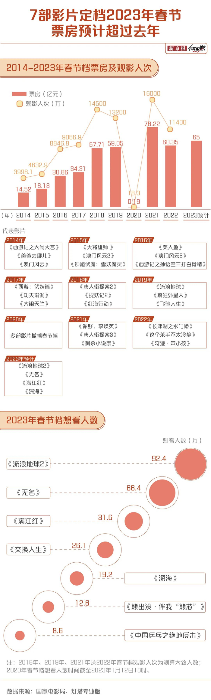 含服务费票房将达65亿元,仅次于2021年春节档,同比2022年上涨7.8%。