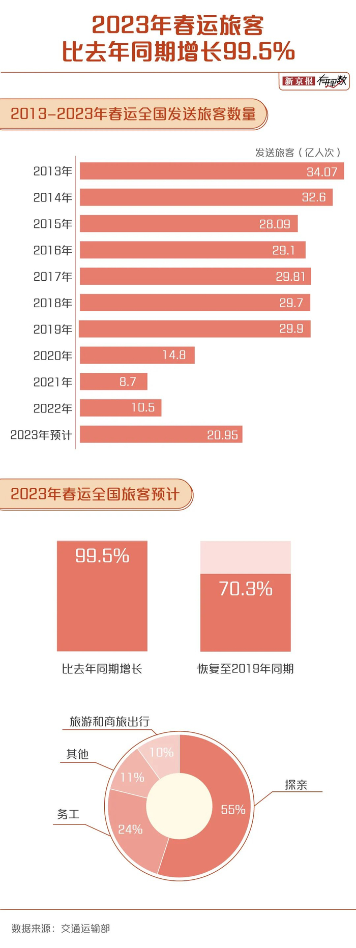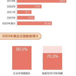而从2022年开始,春运旅客开始出现上涨,尤其是今年对新冠病毒实施“乙类乙管”以来,春运长途客流将明显回升,短途客流进一步增加。据交通运输部初步分析研判,今年春运期间客流总量约为20.95亿人次,比去年同期增长99.5%,恢复到2019年同期(29.8亿人次)的70.3%。