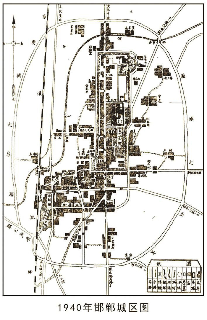 到20世纪40年代前期,邯郸城市的面貌发生了较大的变化,在旧县城南部及西部的西南庄一带,经过了较大规模的扩建,形成了西起车站,北到沁河桥,南到今陵园路,东至五金街的新城区,在原县城的基础上扩大了近2倍,城区面积达到2平方公里。在这片新城区内,还逐步建成了一些骨干街道,即新马路(和平路)、浴新街、西南庄后街、邯山大马路、南关大街、火磨街、新华街等,使新旧城区连成一片。在城区外还修筑了围城马路(环城公路),东起大致今中华大街,西到大致今铁西大街,南起大致今贸易街,北到大致今望岭路。邯郸通往各县的公路也由围城马路分道,四通八达。这一时期的邯郸城,不仅城区面积可观,而且形成了以新民路为中心的商业市场,这里店铺林立,工商业聚集,人口稠密,初步形成了冀南地区的工商业城市。