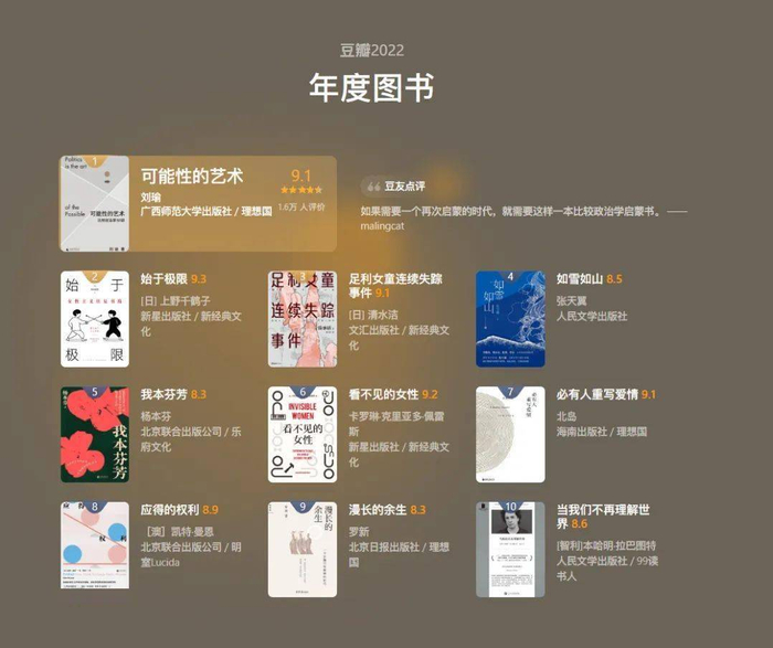 豆瓣的年度图书与小说类的年度图书女性特色鲜明,跻身于年度图书的作品有《可能性的艺术》《始于极限》《足利女童连续失踪事件》《如雪如山》《我本芬芳》《看不见的女性》《必有人重写爱情》《应得的权利》《漫长的余生》《当我们不再理解世界》。