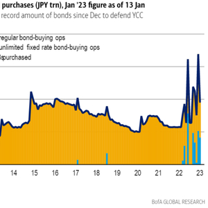 如今迈入2023年才半个月时间,日本央行在国债市场的份额已经跃升了整整一个百分点,达到53%。如果再继续下去,只需要33周,日本央行就会无债可买,整个日债市场就被其收入囊中。