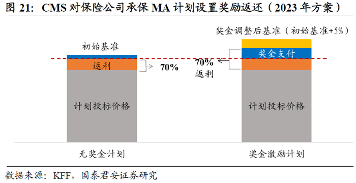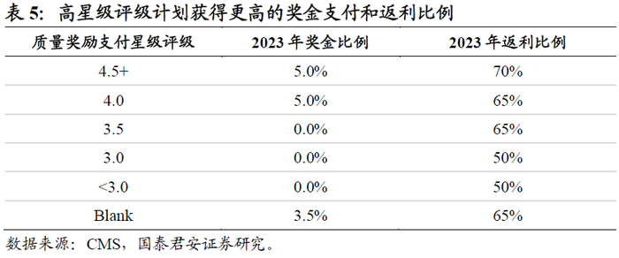 CMS设置奖励返还机制引导保险公司控费,一方面增收,另一方面提升产品对客户的吸引力。《平价医疗法案》提出质量奖励支付(QBP)模式,CMS根据联邦医疗保险支付Medicare计划的最高金额设置基准费率,如果保险公司的投标价格低于基准费率,那么保险公司将会获得一笔返利(Rebate),即基准费率与投标价格差额的一定比例,这部分返利必须作为额外福利返给客户。返利比例根据MA计划的星级评级而有所差异,以2023年五星评级计划的返利为例,返利比例为基准费率与投标价格差额的73%。除此以外,MA计划将基于星级评级获得额外的奖金(Bonus),通常是在基准费率的基础上获得一个额外比例的奖励,2023年五星评级计划的奖金为5%。因此,对于有能力通过控费提供高性价比且高质量产品的保险公司既能够实现增收,又能够提升产品对客户的吸引力,形成市场化的控费机制。