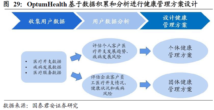 联合健康基于长期积累的健康险理赔和服务数据识别高风险人群,为其建议差异化的健康管理服务。OptumHealth的健康管理服务计划基于强大的数据积累和分析。公司在长期的服务提供过程中进行用户数据的收集和积累,包括医疗开支数据、疾病发展数据、医疗服务数据等,在此基础上进行数据分析,对个体、团体等不同的客户群体进行分类信息加工处理。对个体客户而言,数据分析重点优化客户的医疗费用管理、疾病风险评估等,并给用户提出个性化的疾病管理方案;对团体客户而言,数据分析可为企业设计费用管理方案和疾病管理方案,帮助企业客户了解员工医疗开支情况、健康状况和疾病风险。
