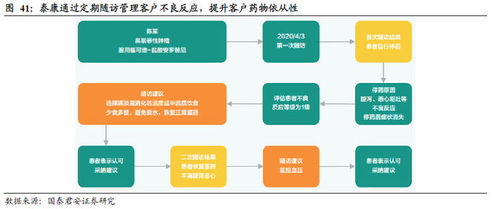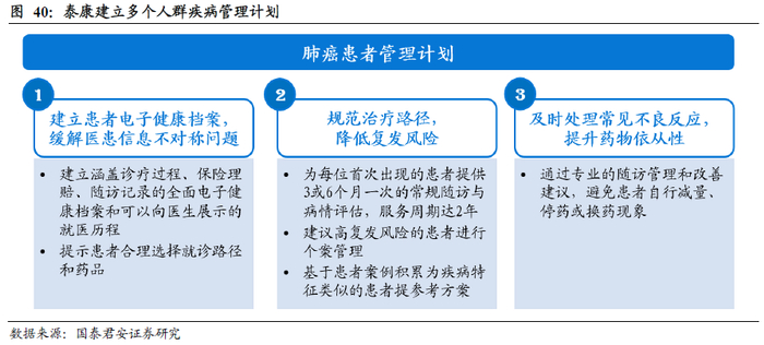 泰康建立肺癌患者管理计划提升治疗效果、降低复发风险、改善药物依从性,从而实现有效控制疾病且降低赔付费用的效果。泰康的肺癌患者管理计划主要分为三个部分,通过改善患者诊中、预后等行为优化治疗效果,真正服务于客户,同时也起到了降低赔付的效果。一是建立患者电子健康档案,缓解医患信息不对称问题。考虑到当前国内就医过程中医患语言交流时间极短,泰康通过建立涵盖患者诊疗过程、保险理赔、随访记录的全面电子健康档案和可以向医生展示的就医历程来改善医患信息不对称的问题,提升就医效率。二是规范治疗路径,降低复发风险。泰康为每位患者提供3或6个月一次的常规随访与病情评估,服务周期长达2年,同时建议高复发风险患者进行个案管理,降低疾病复发风险。三是及时处理常见不良反应,提升药物依从性。为减少患者因常见不良反应而自行对药物减量导致治疗效果不及预期的情况,泰康通过专业的随访管理和改善建议,来提升患者的药物依从性。