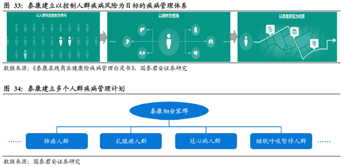 为解决“长寿时代,人人带病生存”的痛点,泰康建立以控制人群疾病风险为目标的疾病管理体系。泰康建立的疾病管理体系以控制客群的健康风险为导向,以病种为视角,以患者旅程为线索,针对客户疾病风险特征提供主动式健康管理服务。这一体系不同于当前大部分公司以提供增值服务促进保险销售的商业模式,而是基于数据分析研究制定不同病种的医疗健康管理服务方案,实现对客户健康状况的监测,辅助客户维持在规范化的诊疗路径上,从而控制疾病发生、疾病进程,实现降低出险率并减少医疗支出。当前泰康已建立多个人群疾病管理计划,覆盖肺癌、乳腺癌、冠心病、睡眠呼吸暂停等病种,与联合健康细分客群提供差异化服务的商业模式有异曲同工之妙。