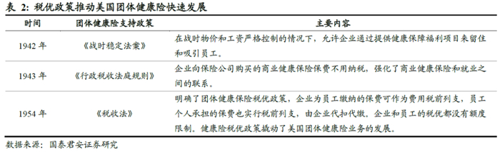 团体健康险兴起的主要原因是税收优惠政策,而奥巴马医改更是将健康险定位为半强制险种。1942年起,美国接连推出《战时稳定法案》、《行政税收法庭规则》、《税收法》等政策,通过税收优惠的政策吸引企业为员工购置团体健康险。2010年奥巴马推动国会通过《患者保护与平价医疗法案》(Patient Protection and Affordable Care Act),旨在通过强制参保和政府补贴实现全民医保。其中对于企业,强制要求拥有50名以上正式雇员的企业必须为员工提供医疗保险,违规企业将被处以罚款;此外,要求拥有200名以上员工的大型企业必须自动将所有雇员纳入其提供的医疗保险计划中,进一步推升了团体健康险的增长。