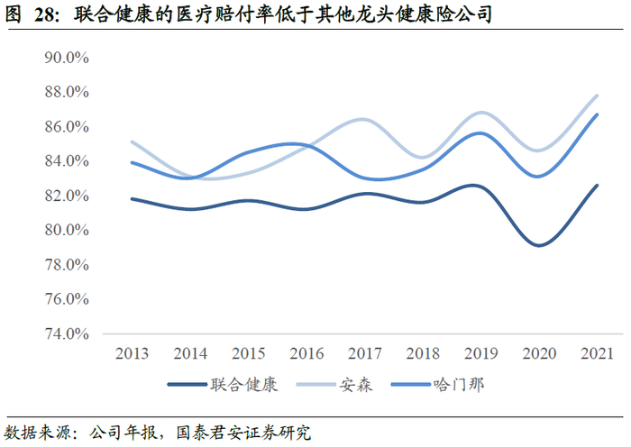 联合健康的核心竞争力在于基于长期积累的数据优势细分客群,有针对性的提供差异化的高品质服务,从而实现控赔降费。联合健康得益于保险+服务的商业模式,一方面基于旗下UnitedHealthcare、OptumHealth和OptumRx长期积累的理赔数据进行客群细分,重点管理高赔付客群的医疗健康;另一方面借力其OptumHealth和OptumRx的医疗和药品资源为客户提供高质量、高性价比的医疗健康服务,从而满足政府、企业等客户的需求,形成独特的竞争优势。联合健康的全量客群全流程健康管理服务有效降低公司的医疗赔付率(Medical Loss Ratio,MLR),根据年报披露,联合健康的MLR长期优于主要同业,2021年联合健康的MLR为82.6%,明显优于安森保险(87.8%)和哈门那(86.7%)。