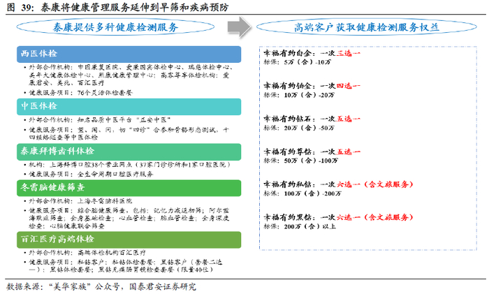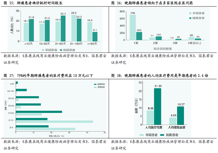 早发现早治疗对降低医疗费用支出有较大的作用,泰康将健康管理服务延伸到早筛和疾病预防。根据泰康对肺癌的理赔样本分析看,肺癌患者确诊耗时时间较长,早期肺癌患者发病通常无明显症状,多数患者确诊路径较长,包括体检发现结节、首次医院就诊、复查、手术、病理确诊等。根据泰康的理赔样本分析,46%的早期肺癌患者确诊需要花费2个月以上的时间;晚期肺癌患者有明显症状,其中31%的患者在发现症状后2个月以上完成确诊。此外,早发现早治疗对降低医疗费用支出有较大的作用,泰康理赔样本数据显示,79%的早期患者医疗费用10万元以下,42%的晚期患者治疗费用10-30万元,晚期肺癌患者的人均医疗费用是早期患者的2.6倍。基于此,泰康将健康管理服务延伸到早筛和疾病预防管理,在其高端客户私享服务中专设了健康检测服务,幸福有约白金及以上客户每年可以享受一次健康检测,可选服务包括西医体检、中医体检、泰康拜博齿科体检、冬雷脑健康筛查、百汇医疗高端体检等,有利于客户及时了解身体状况,一方面改善健康状况,另一方面也有助于实现疾病早发现早治疗降赔付的效果。