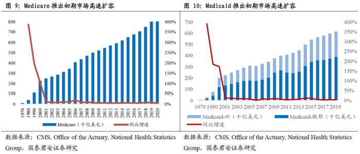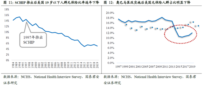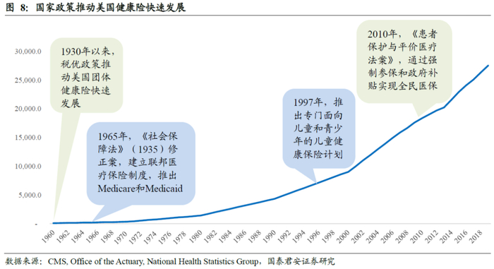 社保类业务推出的主要原因是国家通过政策扶持弱势群体,满足其就医服务需求。1965 年,美国联邦政府签署《社会保障法》(1935)修正案,确立了联邦医疗保险制度,推出最重要的两类社会保险,分别是针对 65 岁及以上老人和残障者的Medicare以及针对低收入人群的医疗保险Medicaid。在政策推出前20年,Medicare和Medcaid规模高速增长,是当时健康险增长的主要来源。1997年美国推出州儿童健康保险计划(State Children’s Health Insurance Program, SCHIP),专门面向儿童和青少年,目的是解决那些家庭收入不足以承担商业健康保险但又超出申请医疗救助计划资格的儿童及青少年缺乏医疗保障的问题。获得该计划批准的家庭在获得医疗服务时仅需根据其家庭收入缴纳少量费用或不需缴纳费用。这一计划的实施进一步拓展了社会保险的覆盖人群。在2014年实施奥巴马医改政策后,进一步扩大了Medicaid的覆盖范围,覆盖人群增加至收入在联邦贫困线138%以下的居民;同时要求各州建立“政府医保交易平台”,为无法从其他渠道获得医疗保险的个人,以及雇员人数不超过100人的小型企业提供医疗保险,且部分人群享受保费折扣。
