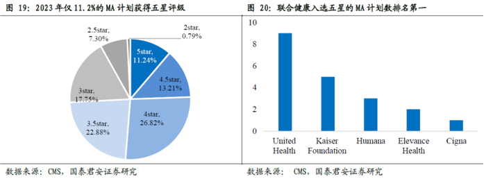 CMS采用星级评级评判MA计划的质量,有效管控商业健康险公司的产品质量。CMS每年发布MA计划的星级评级,以衡量购买MA计划的消费者获得的健康服务的质量,通过提供MA计划评判标准等有效信息来帮助消费者进行MA计划的选择。MA计划星级评级共包含过程管理、中期结果评估、患者体验与投诉、健康改善评估和高效性评估等5大领域28项指标,有效管控商业健康险公司提供的MA计划的产品质量。根据2023年MA星级评级结果,在参与星级评级的507个MA计划中,共有57个计划获得5星,占总MA计划的11.2%。其中,联合健康入选五星的MA计划数达9个,排名第一。