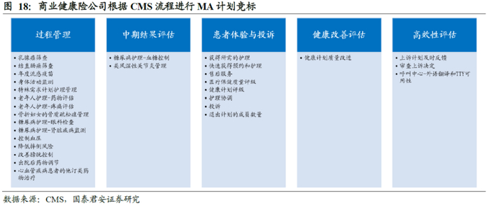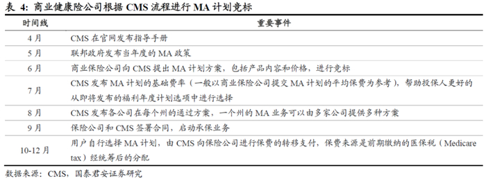 商业健康险公司通过竞标方式参与MA计划,提供具有竞争力的产品获得承保资质。MA计划的承保采用招投标的方式,由美国卫生部下的CMS(Center for Medicare & Medicaid Service)统筹管理,商业健康险公司设计MA计划,向CMS申请,在各州以竞标的方式优选费用低、服务质量高的MA计划,竞标成功的公司获得当年MA计划的承保。