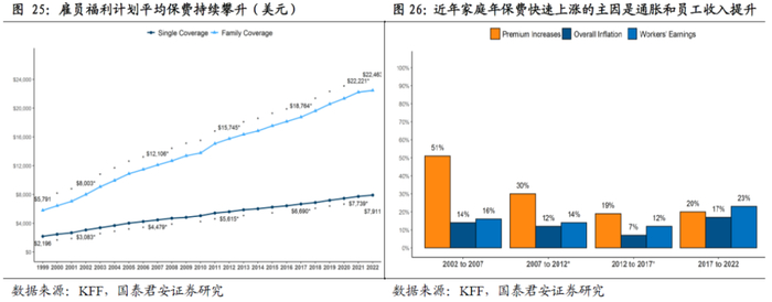 雇员福利计划保费持续攀升对雇主造成较大的负担,健康险控费成为雇主的重要诉求。奥巴马医改强制要求拥有50名以上正式雇员的企业必须为员工提供医疗保险,而雇员福利计划的平均保费呈现持续攀升的状态,对美国企业雇主造成极大的成本负担。根据KFF调研数据,1999-2022年,雇员福利计划中个人年保费由2196美元上升至7911美元,而家庭年保费由5791美元大幅上升至22483美元。面对较高的成本支出压力,雇主加大了对承保方的控费诉求。根据KFF调研数据,2002-2022年家庭年保费快速上涨的核心驱动因素已经由保费上涨转变为员工收入上涨和通胀的影响,健康险产品的控费取得了明显的成效。