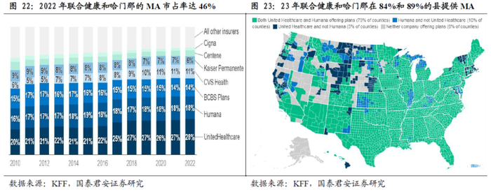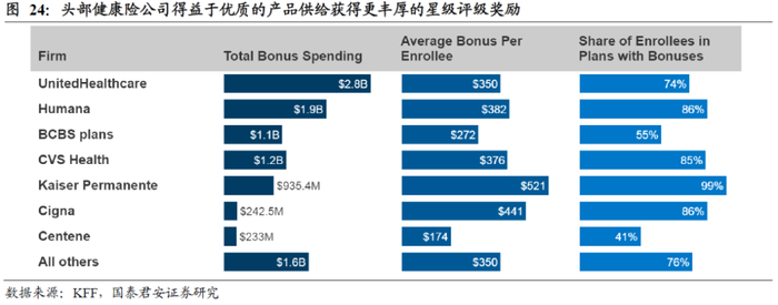头部健康险公司得益于优质的产品供给和产品可及性获得更高的MA计划市场份额。美国居民普遍选择提供优质产品的MA计划,这使得MA计划的承保方高度集中,且市场格局极其稳定。根据凯撒基金会统计,2010-2022年前五大健康险集团服务的MA计划参与者市占率从66%提升至77%,均为头部健康险公司,分别为联合健康、哈门那、双蓝协会(包括安森)、CVS健康和凯撒医疗。一方面,头部健康险公司的产品可及性非常高,根据凯撒基金会统计,2023年联合健康和哈门那的MA计划分别覆盖全国84%和89%的县。极高的覆盖面使得参与Medicare的居民中分别有95%和92%的人曾经使用过联合健康和哈门那的MA计划。另一方面,头部健康险公司得益于优质的产品供给普遍获得更丰厚的星级评级奖励。根据凯撒基金会统计,2022年头部五家公司的星级奖励金额达到79.4亿美元,占比79.3%。其中,凯撒医疗的MA计划得益于较高的产品质量评分获得更高的人均评级奖励,2022年人均评级奖励为521美元。