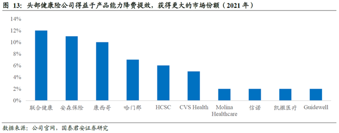 政府客户和企业客户均采用市场化方式选择商保承保,龙头健康险公司得益于降费提效的能力实现更大的市场份额。考虑到美国医疗费用支出不断攀升,政府和企业客户均有较高的控费需求,因此将控费作为选择承保方的核心考量因素。头部健康险公司得益于产品能力降费提效,从而获得更大的市场份额。