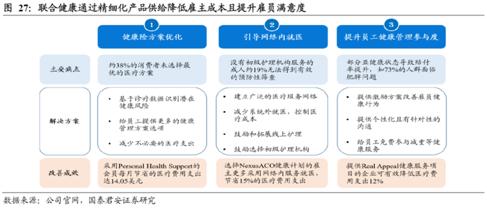 头部健康险公司精细化产品供给降低雇主成本且提升雇员满意度,更易获得企业客户的青睐。以联合健康为代表的头部健康险公司通过提供更为精细化的产品,实现降低雇主成本、提升雇员满意度的成效。根据一家第三方精算机构Wakely的研究,联合健康为其会员节省超过市场10%的医疗费用。具体包括三方面:1)健康险方案优化:为雇主定制合适的健康险方案,包括给员工提供更多的健康管理方案选项、减少非必要的医疗费用开支、基于诊疗数据识别潜在健康风险等,有效控制总医疗成本。根据公司官网披露,采用Personal Health Support(个人健康支持服务)的会员每月节省的医疗费用支出达14.05美元。2)引导网络内就医:通过整合医疗健康资源建立广泛的医疗服务网络,积极引导客户在网络内进行预防-治病-护理的一站式医疗健康服务,避免网络外的资源使用,从而实现成本控制。根据公司官网披露,选择NexusACO健康计划(联合健康的一款责任式医疗健康计划,推荐客户在网络内就诊,但同时客户也可选择在网络外就诊)的雇主得益于更多采用网络内服务就医,从而为雇主节省15%的医疗费用支出。3)提升员工健康管理参与度:通过提供激励方案改善雇员健康行为、提供更多个性化且有针对性的沟通等,根据公司官网披露,提供Real Appeal(减重)健康服务项目的企业可有效降低医疗费用支出12%。