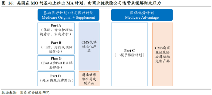 发挥商保市场化控费能力,创设MA计划缓解财政压力。美国Medicare分为两大类,分别是基础医疗计划MO(Medicare Original)和医保优势计划MA(Medicare Advantage)。其中,MO包括住院报销计划(Part A)和门诊报销计划(Part B),在此基础上还有补充医疗计划(Medicare Supplement),用于报销MO中的自费部分,以及药品报销计划(Part D)。上述业务均基于服务付费,医生缺乏控费动力,因而政府难以掌控MO的费用支出。MA是Part C,是由商业保险公司提供的一揽子保险计划,包含门诊和住院报销,部分MA产品还会包含药品报销、增值服务等。政府鼓励商业保险公司参与Medicare的管理,通过优化产品来实现医疗控费,从而缓解财政压力。MA计划自创设后迅速吸引消费者购买,2007-2022年参与MA计划的消费者在Medicare中的占比由19%提升至48%。