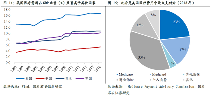 政府是美国医疗费用的最大支付方,财政负担下管理医疗费用成本是核心考量。美国医疗费用占GDP比重长期维持在12%-18%左右,显著高于中国、日本、英国等市场,而同时政府是美国医疗费用中最大的支付方,使得美国政府面临较大的财政负担。费用负担较高,其中政府主导的基本医保为最大单一支付方。根据MedPAC数据,2018年政府主导的Medicare、Medicaid和其他医保的费用支出占到美国医疗费用支出的44%。在财政负担压力下,管理医疗费用成本成为美国政府的核心考量。