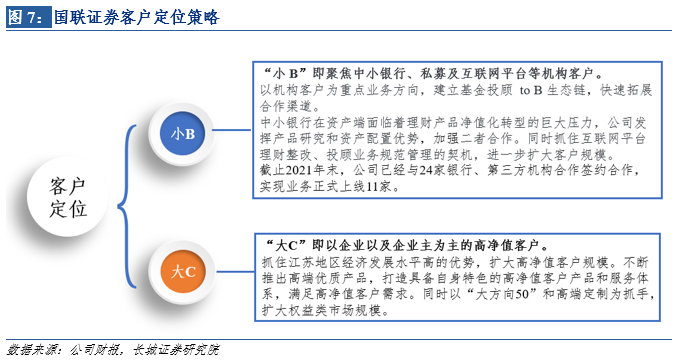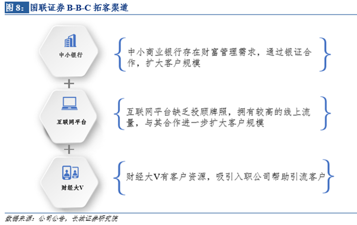 国联证券财富管理业务聚焦小B大C客户。小B指机构客户,抓住中小银行的财富管理需求,公司为其提供产品研究与资产配置服务;抓住互联网理财整改,为没有投顾牌照的互联网平台签约合作协议,借力B端机构客户,从线上线下合力扩大客户规模。对互联网平台的财经大V采用入职激励,获取其持有的客户资源。大C指高净值客户,推出高端优质产品和特色产品,满足高净值客户需求,从C端扩大客户规模。