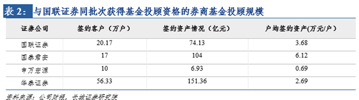 在5+N的基金投顾策略下,业务发展势头强劲,位于行业前列。2021年财报显示,当年基金投顾业务签约客户达到15.03万户,同比+182.6%,总签约资产为102.63亿元,同比+91.6%,每户平均签约资产6.83万元,居于同批次获资质券商首位。