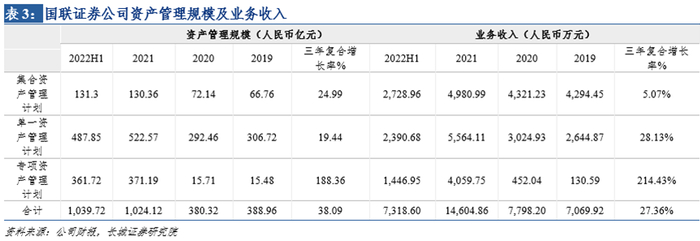 2021年,公司资产管理业务聚焦客户需求,不断加强主动管理能力,加速推进大集合转公募工作,持续提升投研水平、产品创设能力、渠道营销能力及合规风控效能,结合自身的牌照优势,有效提供专业化资产配置和底层资产评价服务,形成核心策略输出,为客户提供全生命周期、全业务链条的综合金融服务解决方案。截至2021年末,据中证协数据,公司资产管理业务受托规模排名第23名,净收入排名第34名,行业排名获得较快提升(之前年度该数据均未达到行业中位数)。截至2022H1,公司管理的资产管理计划共计254个,资产管理业务受托资金人民币1,039.72亿元,同比+35.11%;业务收入人民币7,318.60万元,同比+长34.31%。2022年前三季度实现资管业务收入1.33亿元,同比+62.97%,在行业资管业务收入收缩的情况下,继续保持增长,彰显韧性。