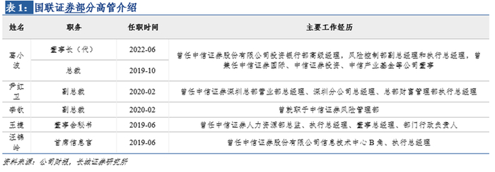 国联证券当前主要管理层多来自于中信证券,代表性人物为公司董事长兼总裁的葛小波先生。因为在龙头券商的工作履历,公司高级管理团队在证券和金融服务行业具备丰富的管理经验、相对优秀的管理能力和前瞻性的战略思考能力,能够较为深刻理解行业和市场的发展趋势,做出相对准确的商业判断,及时捕捉商机,并审慎科学地调整业务策略。