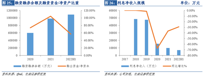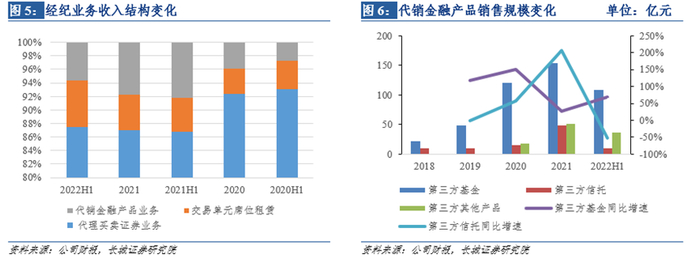 公司代销金融产品业务占比逐步提高,收入结构优化。2022H1公司代理买卖证券业务收入3.45亿元,占经纪业务收入87.34%,传统经纪业务占比最高;代销金融产品收入0.22亿元,从2018年占比2%上升到2022H1的5.57%,交易席位租赁收入0.27亿元,占比6.84%,呈现提升趋势。在代销金融产品的结构中,代销基金产品提升较快,从2018年22亿提升到2021年153.18亿元,2022H1达到108.53亿元,2019、2020、2022H1同比+ 118.19%、150.13%、67.87%。财富管理业务推进经纪业务收入结构优化,代销基金规模高速提升,但在总的经纪业务中占比还较小,仍有较大的提升空间。