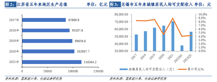 无锡、苏南和长三角区域是国内经济总量最大、最具活力、发展质量最高、上市公司和高净值人群最多的区域之一。2020年起江苏省GDP总量超10万亿元,证券公司客户、市场极为广阔。其中2021年无锡全市实现地区GDP总量1.4万亿元,在江苏省内占比12%且排名第三仅次于苏州市与省会南京市。截至2022年11月9日,无锡市的A股上市公司超过百家,其上市公司总市值在江苏省内占比排名第三。根据2021年胡润中国高净值家庭财富榜单,无锡市以600万财富家庭数量41000户,排在全国第18位江苏省第三位。无锡市国联证券是无锡唯一一家综合型法人证券公司,可以充分利用区位优势,发展投资银行业务和直接投资业务。