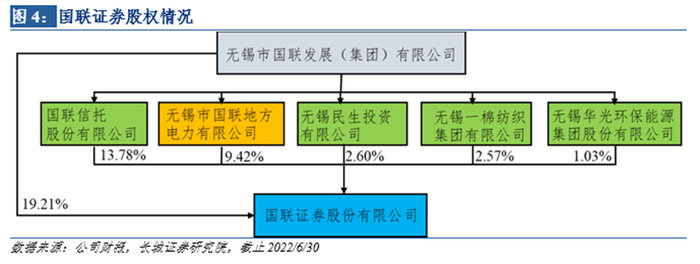 国联证券实际控制人是无锡市人民政府国有资产监督管理委员会,具备优质稳定的股东资源支持。截止到2022H1,无锡市国联发展(集团)有限公司对国联证券的持股比例为19.21%,“国联集团”还通过其控制的子公司间接持有国联证券股份,合计48.62%。