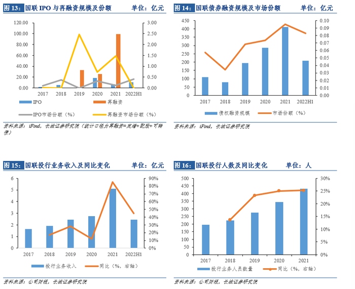 投行业务收入提升规模迅速,团队扩张加快,补足业务短板。截止2022前三季度,公司的投行业务收入达到4.24亿元,同比+35.55%。公司为加大投行与直投联动,设立国联通宝、国联创新子公司,分别从事私募投资和另类投资,2021年均实现利润与收入高增。