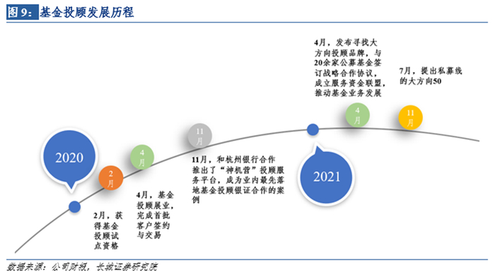 公司把握基金投顾领先优势,实现公募投顾到私募投顾的全面覆盖。国联证券是首批获得基金投顾资格的券商,2020年2月获得资格,同年4月率先开始展业,11月与杭州银行合作推出“神机营”投顾服务平台,成为业内落地银证合作的典范。2021年4月,发布国联财富管理的自有品牌“大方向”,在公募投顾的基础上,7月提出以私募投顾业务为主的“大方向50”战略。