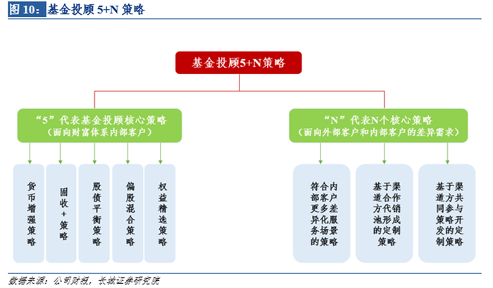 2021年4月“大方向”首次提出了“5+N”策略及服务体系体系,“5”代表基金投顾核心策略,包括货币增强策略、“固收+”策略、股债平衡策略、偏股混合策略、权益精选策略的五种不同风险收益特征的策略,覆盖了从目标回撤不超过千分之一到不超过20%的不同风险收益特征。“N”代表N个核心策略,延伸覆盖三种不同需求,包括符合内部客户更多差异化服务场景的策略、基于渠道合作方代销池形成的定制策略、基于渠道方共同参与策略开发的定制策略。