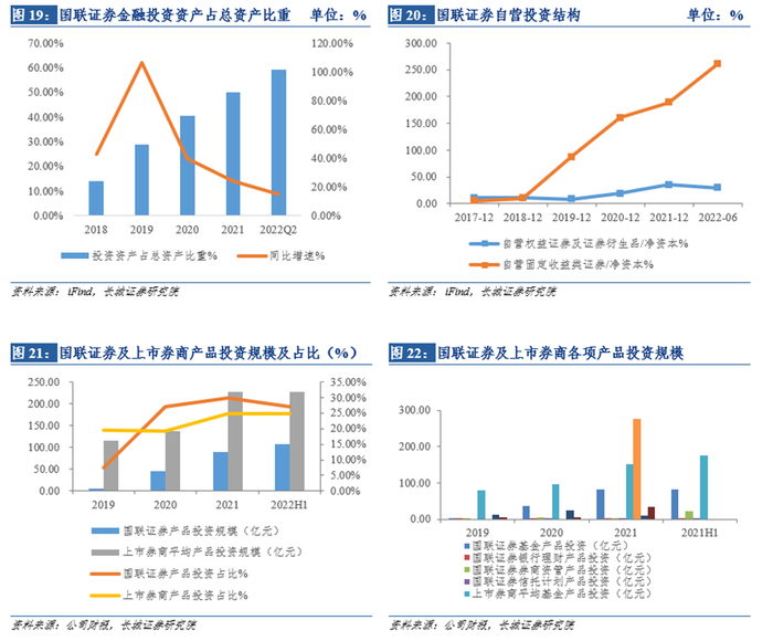 基金、银行理财产品、券商资管产品和信托计划作为交易性金融资产产品投资范畴,产品投资规模增量不断扩大,占比也在不断提升。2022H1,国联证券产品投资规模为106.51亿元,占交易性金融资产的26.90%,超过上市券商均值(24.79%),其中基金产品投资为81.79亿元,同比+69.62%,信托计划产品投资为1.18亿元,同比-27.61%。